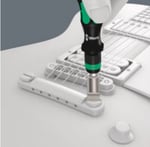 The Kraftform bit-holding handle can also be used with the included 1/4" string crank and Wera Zyklop sockets, thanks to a 1/4" hex to 1/4" square socket adaptor.
